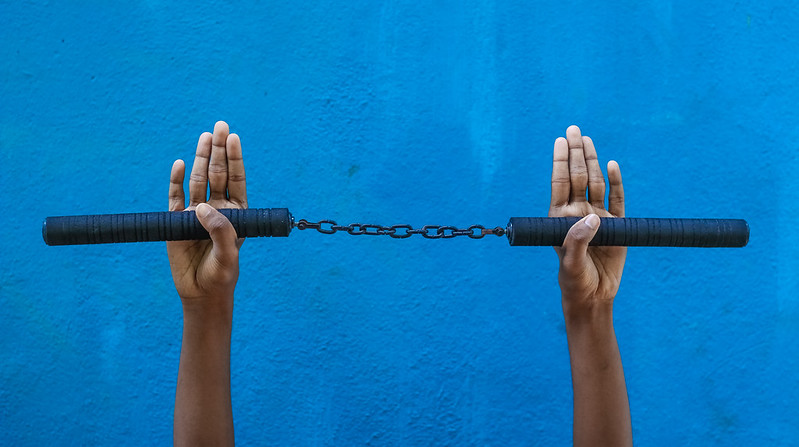 There are many varieties of nunchakus but they are primarily made of two sections of wood connected by either a chain (kusari) or a cord (himo). Okinawan nunchakus have an octagonal cross-section that increases the force of contact on one end of the weapon, while the Chinese version is more rounded. Ideally, the pieces of wood should be long enough to protect the forearm when the nunchucks are held high at the top of the shaft. There are asymmetrical nunchuks, but typically both sticks should be of the same length. The chain or rope holding the two sticks together should be long enough to allow the user to lay the weapon over the palm of the hand with both sticks perpendicular to the ground and hanging comfortably. The pieces of wood should be perfectly balanced to be able to execute the techniques used with the nunchaku.