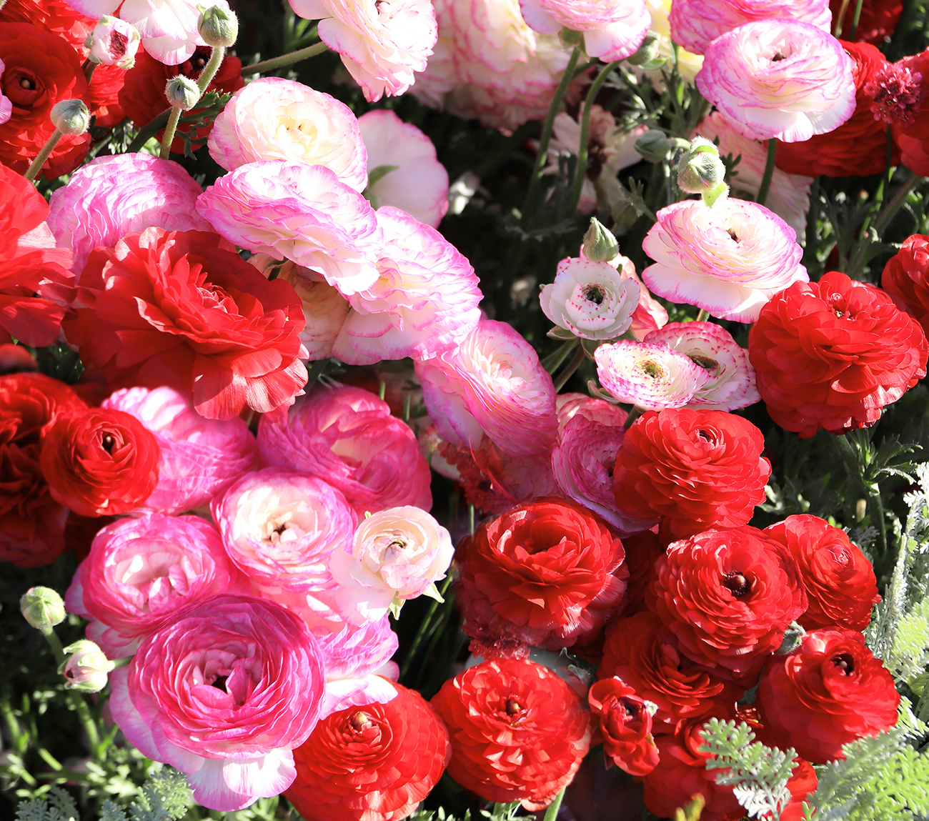 Persian buttercups (ranankyurasu, ラナンキュラス) with their layers of crinkly and delicate petals and fern looking leaves, are a delightful addition to any spring bouquet. These flowers come in all colors of the rainbow and bloom in all its full glory for an entire six weeks. Persian butetrcups belong to the Ranunculus, a large genus of about 600 species of flowering plants of the family Ranunculaceae. Other members of the genus are also known as spearworts and water crowfoots.