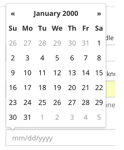 To pick a date that is years away, is there a faster way than clicking through all the months? Applying Yes! If you click on the month and year at top center (January 2000 in this example) you will see the year at top center (2000, here). From here, you can click << or >> to hop across years and then drill down into the month, etc.